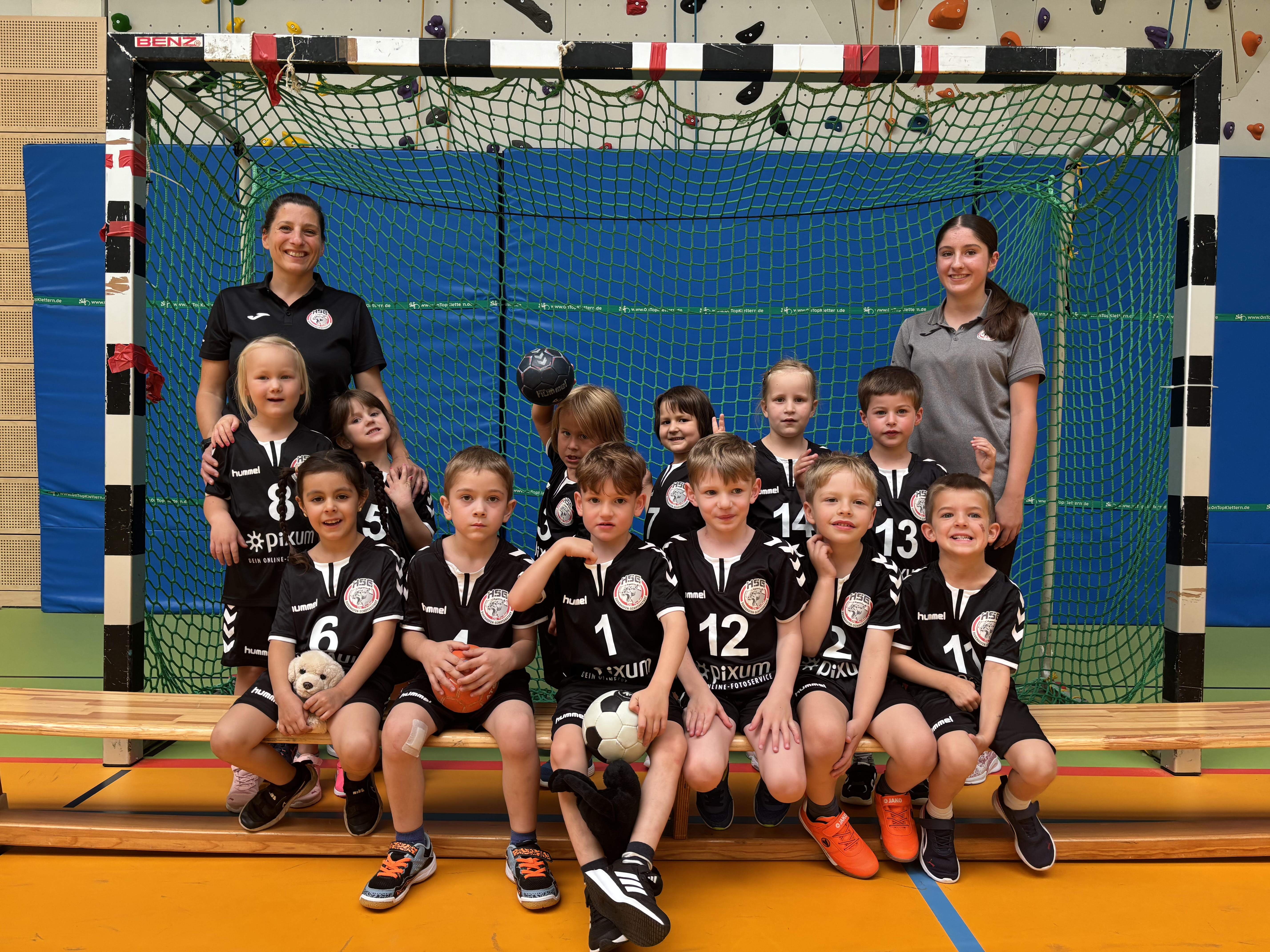Hintere Reihe: Sandra (Trainer), Isabella, Jola, Joshua, Anni, Emily, Noah, Lina (Trainer)